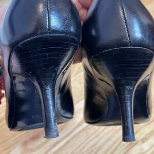 Black leather pumps with an adorable open toe made up of three straps of leather, two smooth, and one embossed with a snake or croc pattern, all joined with two loops of leather at the center for a very polished and stylish look.