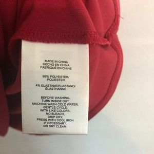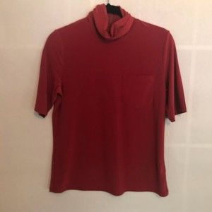 Jones New York red stretch short sleeve blouse. Mock neck with slight pleating and zip back detail.