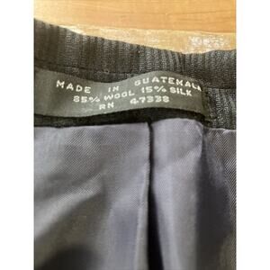 Crafted with impeccable attention to detail, the Jones New York Men's Black Silk Wool Sport Coat in size 44L epitomizes sophistication. This distinguished striped suit jacket blazer exudes timeless elegance, making it a versatile piece for various occasions. The luxurious blend of silk and wool offers a unique texture that sets it apart from ordinary sport coats. Elevate your ensemble effortlessly with this tailored garment, whether for business meetings or formal events. Designed to provide a sleek and polished look, this sport coat is a must-have for the discerning gentleman seeking refined style and superior quality in their wardrobe. Experience the blend of comfort, style, and sophistication with this Jones New York masterpiece.