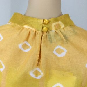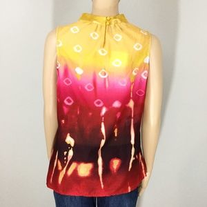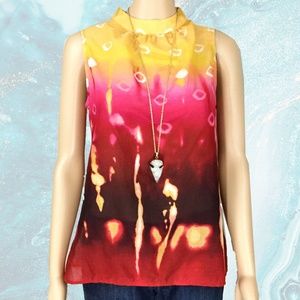 High neck sleeveless ombre top with tie dye look throughout gives a sunset vibe. Buttons behind neck and includes spare buttons. Super comfortable in 100% cotton. This is a petite size so please note length below.