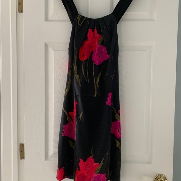 Feels like silk. Excellent condition. Worn once! Criss cross back strap tie off. Black, Pink, Red, Gold multi color