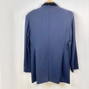 Elegant and timeless two-piece navy suit by Jones New York. This coordinated set features a beautifully tailored blazer with silver-tone crest buttons and a black velvet collar, paired with a matching pleated skirt adorned with coordinating decorative buttons. The structured design offers a polished, classic silhouette perfect for professional wear, equestrian style, or a sophisticated evening look.