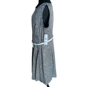 New with tags Jones New York Dress Woman sleeveless dress in a navy and ivory abstract dot print. This flattering A-line silhouette features a scoop neckline, removable thin ivory belt, and fully lined interior. Effortlessly stylish for work, weddings, or special occasions.