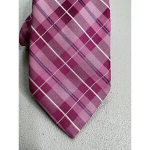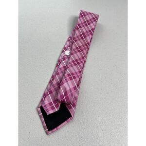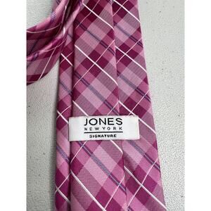 The product is a classic men's tie from Jones New York in a pink, blue, and white plaid pattern. Made of polyester, this tie is 57"-60" long with a classic width, making it suitable for a classic look. Perfect for adding a pop of color and pattern to a formal or semi-formal outfit. Some discoloration on inside tag. New without tags.