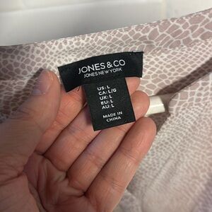 This relaxed blouse from Jones New York showcases a soft pink color and a chic mandarin collar. The buttoned design and flowing cut provide a comfortable yet polished look, ideal for casual outings.
