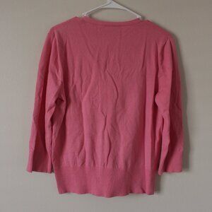Bubblegum pink cardigan from Jones New York Sport. Three-quarter length sleeves, multi-color square buttons, and a tiny pocket near the hem. Ribbed on the sleeves and hem. 69% cotton, 31% nylon. Size large, looks like it'd be fitted. Gently used, no notable flaws.