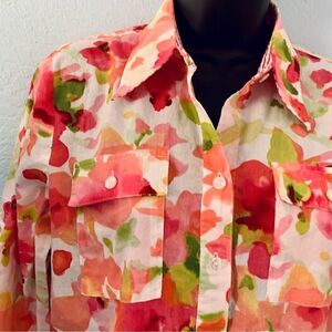 Pink & green w/white background floral print button down shirt. Crisp pointed collar. Double chest pockets. Long sleeves with option to roll & button. Split side hemline. 100% cotton fabric. In excellent preowned condition. Jones New York Size Small