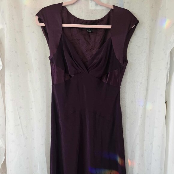 Sweetheart neckline and dual fabric look. A shimmery matte-ish and a matching satin. I believe they are 2 sides of the same fabric, used brilliantly. Cap sleeves have the slightest bit of padding in them to maintain the beautiful design. Fully lined.
