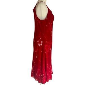 Beautiful Jones New York slip dress in a rich red floral print. Made from lightweight 100% viscose rayon and crafted in Hong Kong, this vintage-inspired dress features fixed spaghetti straps, a bias-cut drape, and a flattering silhouette. Perfect for weddings, summer parties, or vacation wear.