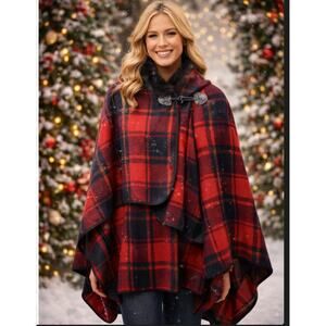 Red and black plaid cape-style poncho by Jones New York with faux fur trim at the neckline and a faux leather toggle closure. Dramatic draped silhouette with open sides makes this easy to layer over knits, turtlenecks, denim, or tailored trousers. One-size poncho fit works well worn loose or belted over the waist for structure.