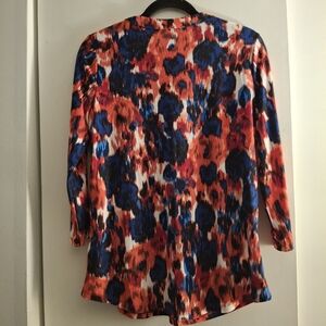 This relaxed blouse from Jones New York features a striking graphic design in red and blue hues. The 3/4 sleeve length and mandarin collar add a touch of elegance, making it perfect for both casual and office settings. Its flowing fit ensures comfort and style throughout the day. Size medium. Pit to pit measures 19 inches. Length 25 inches.