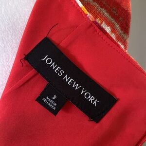 Used Good Condition. Elevate your cocktail attire with this stunning sheath dress from Jones New York. Featuring a sleeveless design and a sophisticated bateau neckline, this midi dress is crafted in vibrant red and pink hues. Perfect for a night out, its sleek silhouette ensures a chic and polished look. Back zipper.