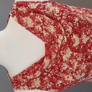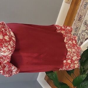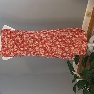 Pretty Jones New York red and tan lined floral below the knee pullover dress with a ruffle at hem.