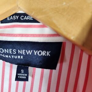 The Jones New York Signature Easy Care sleeveless blouse is the perfect addition to any summer wardrobe. Made of 100% cotton, this blouse features a classic button front design and eye-catching red and white stripes. The slightly rounded tail adds a playful touch, while front and back darts create a flattering, fitted shape. Perfect for work or play, this blouse is a must-have for any fashion-forward woman. Machine washable.
