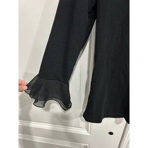 career, office, dark feminine, whimsigoth, Jones New York, black blouse, ruffle top, professional blouse, office wear, M size blouse, polyester blouse, flared sleeves, long sleeve blouse, sheer cuffs, office attire, pullover blouse