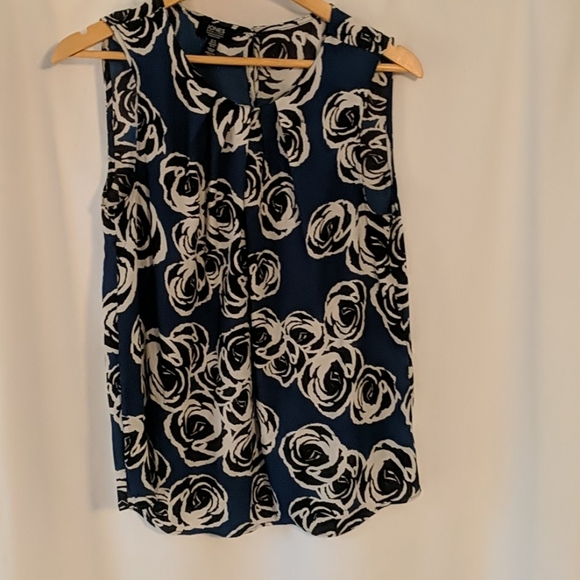 Beautiful blue with black and white modern rose print. Wear with white jeans for a casual look, pair with black for work.