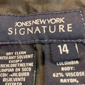 Jones New York Signature black skirt with peplum hem in size 14: 20.5” with 18” waist measurement flat and 21” hip measurement flat. Skirt is lined but not peplum hem. New condition! Very nice for career or dress.