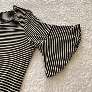 This top features a classic black and white stripe pattern with elegant short bell sleeves, offering a relaxed and boxy fit. Perfect for both casual and semi-formal occasions, it combines style and comfort effortlessly. In excellent preowned condition with no flaws.