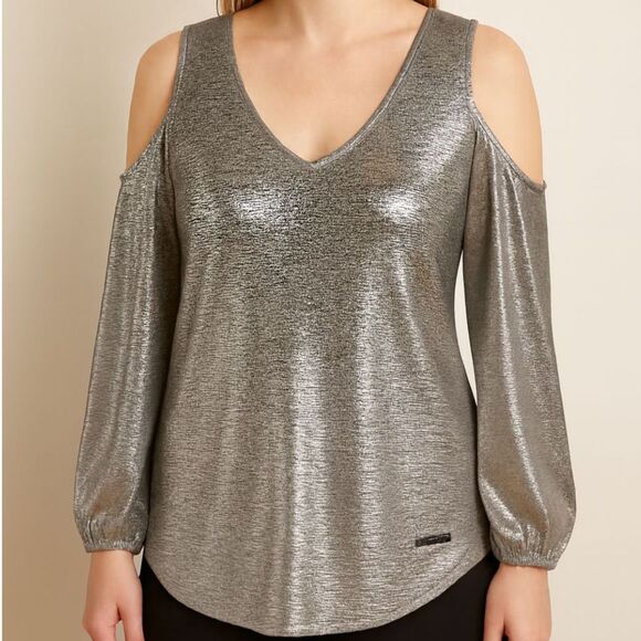 jny top, cold shoulder, metallic blouse, shimmer knit, long sleeve top, vneck shirt, signature collection, stretch knit, modern career, dressy blouse, silver top, party outfit