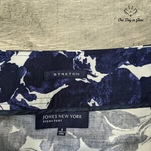 In blue with flowers so bright, this Jones New York skirt is a delightful sight! The cotton-spandex blend feels oh-so-right, like new and ready for your fashion spotlight.