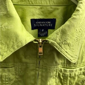Add a bold pop of color to your wardrobe with this vibrant green jean-style jacket from Jones New York Signature. Features a subtle textured floral print for added dimension, classic button details, and a flattering structured fit. Lightweight and perfect for layering—great for spring or fall. Size Small. In excellent condition!