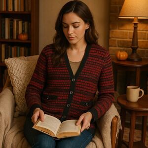 Jones New York Signature, knit cardigan, button front sweater, honeycomb knit, red black ombre, fall layering, cozycore, office casual, holiday outfit, soft knit cardigan, textured knit, vintage-inspired cardigan, classic women’s sweater, winter layering essential.