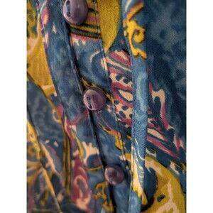 The Jones New York Signature Top in size 1X is a stylish blue multi paisley blouse with a peplum hem, perfect for a bohemian look. This 100% polyester blouse features a round neck, 3/4 balloon sleeves with ruffle accents, and button closure. Ideal for various occasions such as travel, business, casual, dressy, or party/cocktail events, this lightweight chiffon blouse is machine washable and suitable for all seasons. The colorful paisley pattern in shades of blue, lime green, and purple adds a vibrant touch to your wardrobe, making it a versatile and fashionable choice for women.
