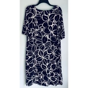 Excellent preowned dress from Jones New York in size 1X. This is a very dark navy color with white floral print all over dress. Material is soft and comfortable. Gathers some at the bust. Dress is knee length with short sleeves. Smoke free home. See pictures. Offers and questions welcome! Thank you for looking.