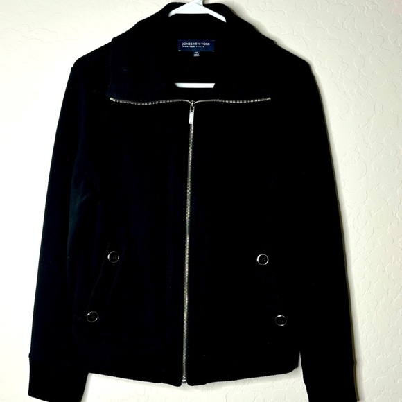Jones New York Signature Petites black zip front jacket in size Petite Medium. Two side front pockets adorned with silver and black buttons and a silver zip up front makes this stylish yet versatile. Great pre-owned condition, no holes or flaws.