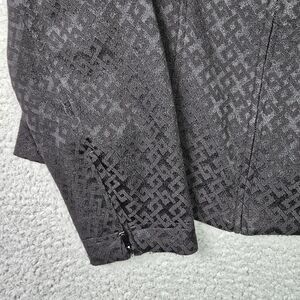Craft a sharp look with the Jones New York Signature women's full zip jacket. This versatile size 12 blazer boasts a shimmery black color, tailored for a regular fit that pairs effortlessly with your favorite outfits. The cotton, polyester, and spandex materials ensure both comfort and a flattering fit. The jacket features a black on black geometric pattern that adds a modern touch to your ensemble, convenient front pockets, and the sleeves with silver zippers at the cuffs add an edgy appeal. Shoulder padded for structure, which could be removed, if preferred. Ideal for business, travel, or casual outings. The jacket is in excellent condition and is dry clean only.