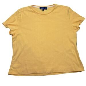Super cute and high quality tshirt. Solid yellow color. Brand is Jones New York signature. No material tag but feels like cotton. No signs of damage or wear. Size large see measurements below
