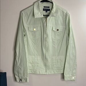 Stylish green striped jacket with front pockets and zip closure. Perfect for Spring!