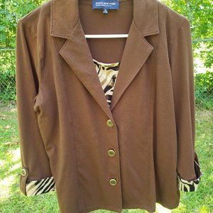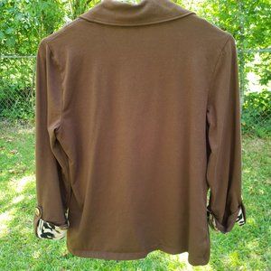 Gently used top by Jones NY Signature petite size PL. No holes or stains. Approximate measurements laid flat (outer layer): pit to pit 19.5”, length 23”. Features are: built in under-shirt, ¾ sleeves, button closure, cotton blend.
