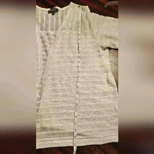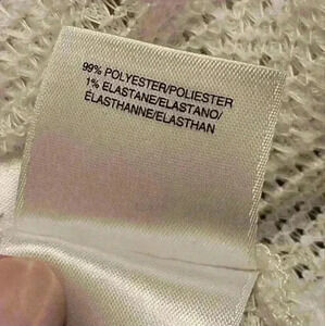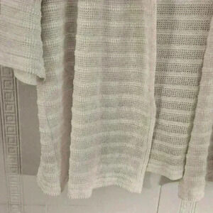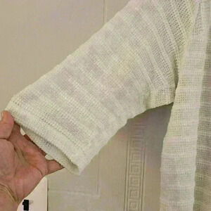Open style, no buttons, 3/4 sleeve, bright white, crochet knit in excellent used condition. 99% polyester 1% spandex.