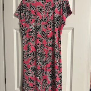 Excellent used/like new condition - wore for 2 events. Jones New York size large pink with black paisley design dress. Faux wrap style provides just the right camouflauge at the waist area without being binding. Very comfy! 95% Polyester and 5% Elastane for that little bit of stretch, non-clingy fit! Washable.