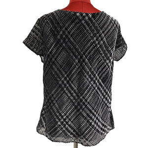 Jones New York Collection popover top - size 12 - black & silver velvet burnout in a mod geometric look with a softly draped neckline and short sleeves. Lined - tagged dry clean only - this blouse will be perfect for special events. Gently worn - no flaws - so cute!