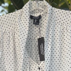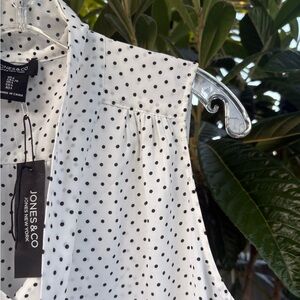NEW with Tags The Jones New York sleeveless blouse features a chic tie front and a sophisticated collar, perfect for warm weather. Its lightweight fabric and classic white color with black dots make it a versatile addition to any wardrobe.