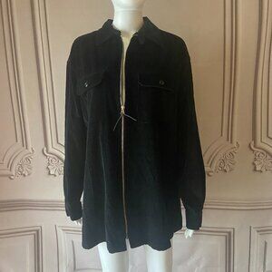 The black, corduroy, zip-front jacket is from Jones New York Sport. It features a full-zip closure with a gold-tone zipper, two chest pockets with button flaps, and sleeves. This style is also sometimes referred to as a "shacket," a shirt-jacket hybrid. The jacket is made from 100% cotton. Classic jean jacket style.