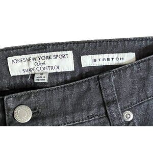 A pair of Jones New York Sport Jeans with shape control in size 10 for women. These grey straight leg jeans are made of a denim/cotton blend.