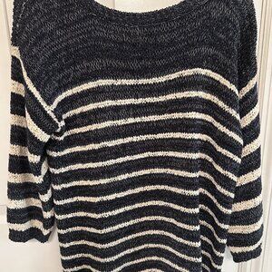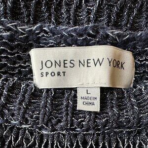Jones New York Sport sweater, size large, featuring a stylish design with a navy blue base and horizontal white stripes. The sweater appears to be made of a textured, knitted fabric, giving it a cozy and casual look. It has a classic crew neckline and three-quarter-length sleeves, which add to its versatile appeal.