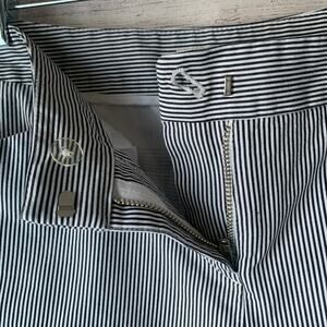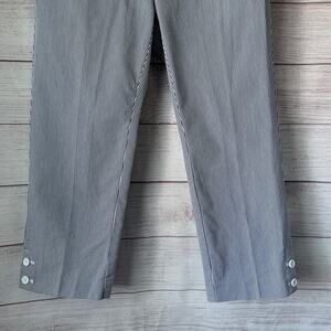 Gray and white pinstripe capri pants by Jones New York Sport Petite. These capris have a hidden zipper and metal hook closure, front diagonal slit pockets, back pockets with a buttoned flap closure, and 2 buttons on the bottom side of each leg. They are pre-owned and in great condition.