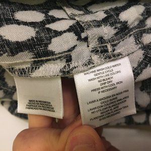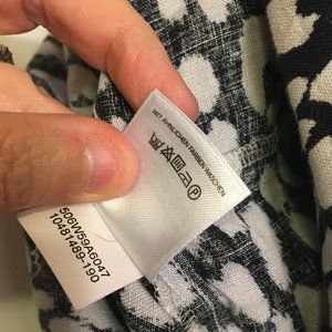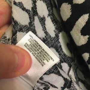 Jones New York Sport Woman Linen Tunic Top in black and white leopard print with 3/4 length sleeves and side slits at hem for comfort.