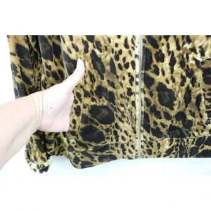 This is a Jones New York Sport Women's Velour Animal Print Jacket that is a size Large. It is very soft and cozy. It is 79% Cotton and 21% Polyester. Laying flat, it measures: Armpit to armpit-21.5" and the length is 25". It is in good condition.