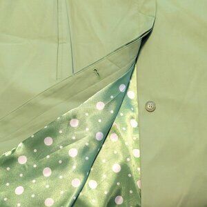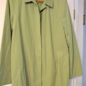 Bright, cheerful, lime green lined trench coat/jacket with slightly padded shoulders and hidden button closure. Pre-owned, in excellent condition.