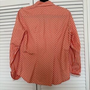 Stylish orange shirt with white stripes. Features polka dot inner collar. Perfect for casual wear.