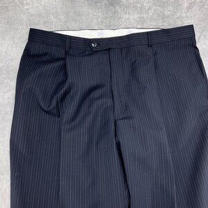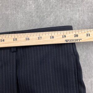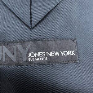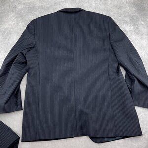 Jones New York suit for men in blue pinstripe, size 44R with 39W x28L. Classic 2-piece wool blend, perfect for career wear.
