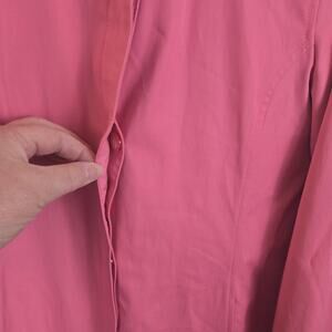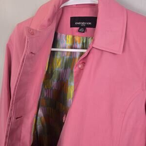 The Jones New York Trench Rain Coat in Pink PETITE, size XS COQUETTE, is a stylish and versatile addition to any woman's wardrobe. Made from a cotton blend outer shell and lined with nylon, this mid-length coat features a single-breasted design with long sleeves and a button closure. Perfect for various occasions including travel, parties, casual outings, workwear, and business meetings, this coat also adds a touch of girly charm with its solid pink color and classic trench coat style. With accents like a collared neckline and pockets, this coat is ideal for the fall and spring seasons, blending elements of art, flower, princess, and colorful themes for a preppy and retro vibe.