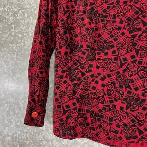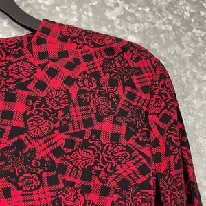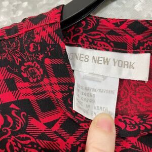 Women's vintage long sleeve blouse by Jones New York from the 1980's. This red and black top has a buffalo check covered in a floral pattern, button cuffs, and button closure at the back of the neck. It is 100% rayon.