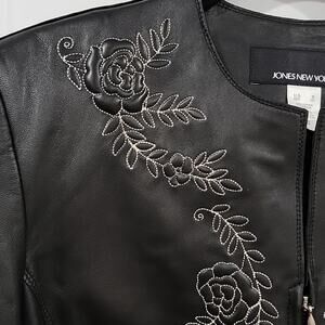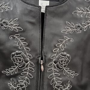Black soft leather jacket with rosette embroidered design. EUC, approximately 18 inches pit to pit.