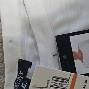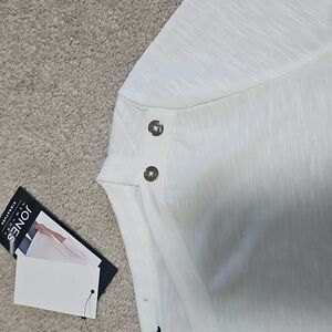 Stylish white short sleeve top featuring button accents on the shoulders. New with tag